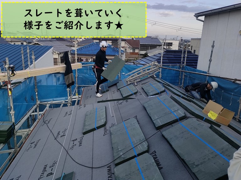 紀の川市在住K様邸の屋根にを葺く様子をご紹介します。最近新築で良く使用されている屋根材で、セメントや繊維材で作られています★塗装されており、様々な色のものをお選びする事ができます(*^^*)グリーン」と言う色のスレートを葺きます!紀の川市でウェザード・グリーンのコロニアルクァッドを葺きました