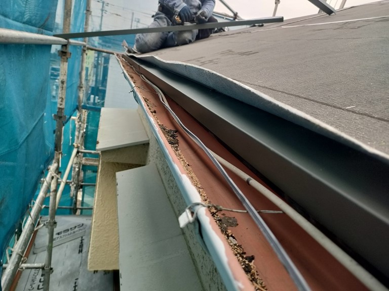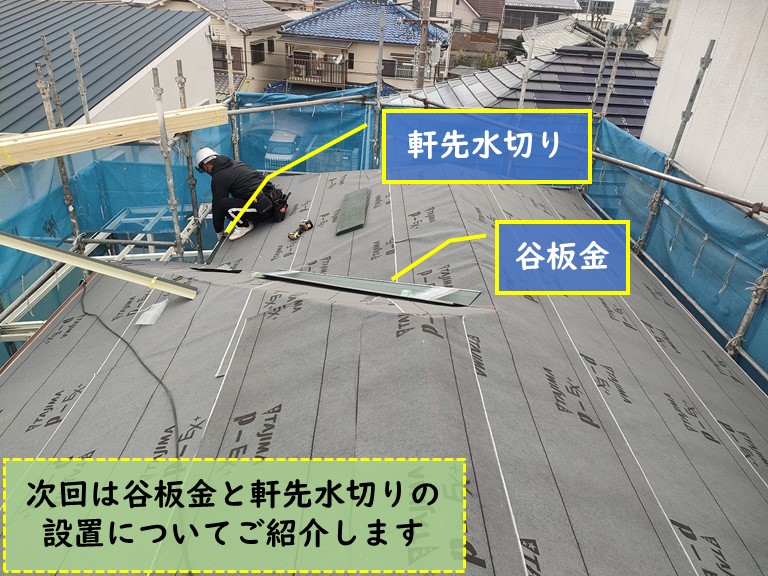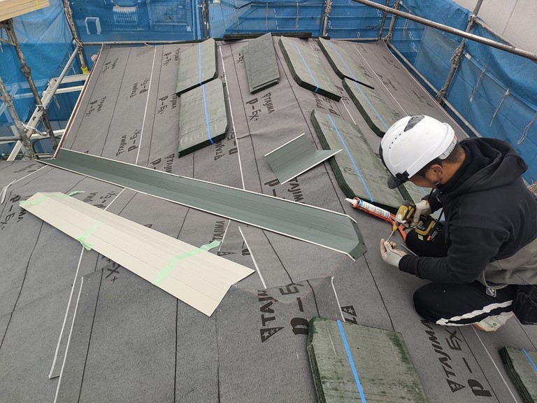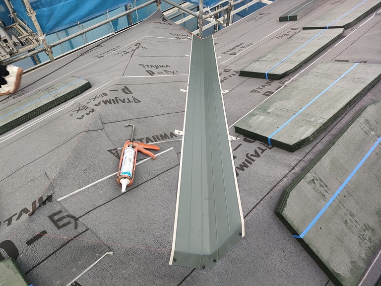 とは屋根や外壁などから雨水が建物内部へ侵入しないように。を設置する様子をご紹介します★≫雨漏りをさせないために、雨水を積極的に誘導して排水させる雨仕舞い屋根で雨漏りしやすい「谷板金」の修理方法
