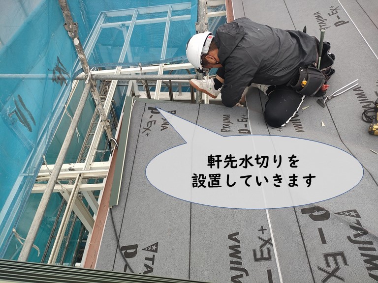 屋根の軒先からも雨水が侵入する可能性があるので、軒先にも水切りを設置します。」と言い、