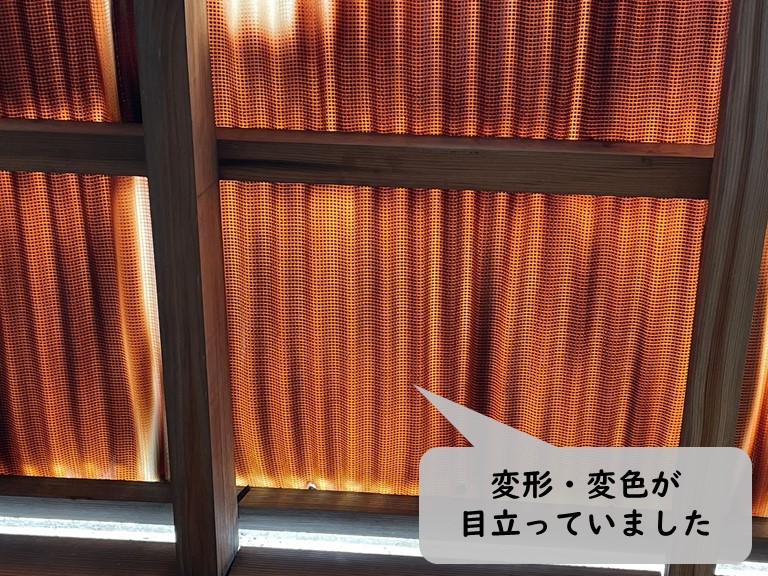 テラス屋根ではカーポートと同じ塩ビ製の波板が使用されていたのですが、テラス屋根の方は、塩ビ波板の中にガラスネットが入った波板でした。塩ビ波板の中にガラスネットが入っていると、入っていない塩ビ波板に比べて強度は高くなります。しかし、ポリカ波板に比べると強度は低く、T様邸のガラスネット入り塩ビ波板も変形・変色が目立っていました。