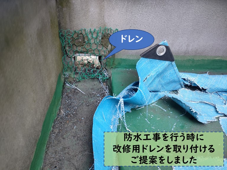 」と呼ばれる排水口があります。内部でひび割れたりする可能性がありますので既存のドレンの上から「改修用ドレン」を被せるご提案もしました。