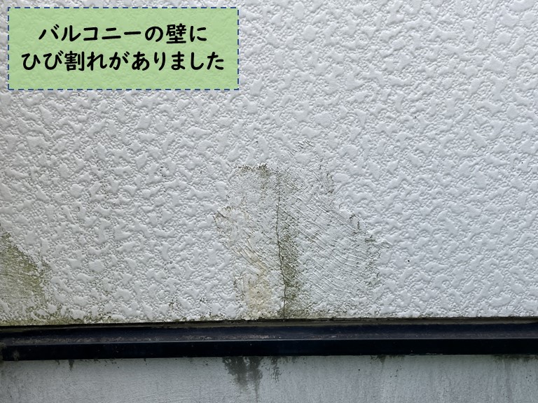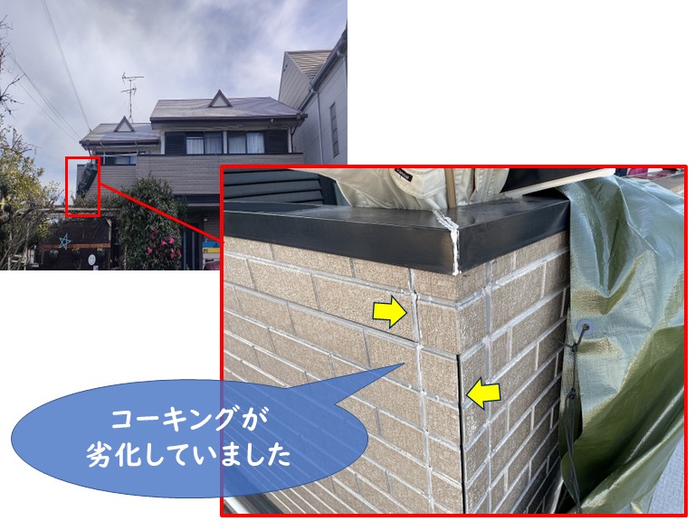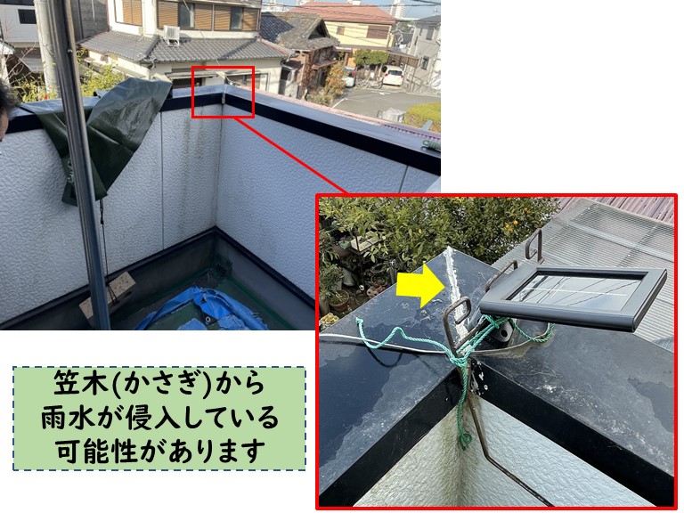 の天端には笠木が設置されていました。とはバルコニーの腰壁や塀などの天端に被せている仕上げ材の事を言い、室内と外部での笠木の役割は少し違っており、外壁に付着する雨垂れを防いだり、躯体の劣化防止としての役割があります!が充填されているのですが、割れて隙間が生じていました。≫シーリングやコーキングの種類と使用方法意外と多い笠木が原因のベランダ・バルコニーからの雨漏り