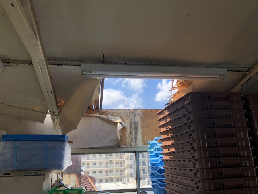 現場に到着して、いきなり目に飛び込んできたのが強風の影響でトタン屋根が飛んでなくなり、下地のコンパネのみになっているプレハブ小屋でした。残っているトタン屋根はごく一部で、少しの風か揺れで今にも落ちそうな状態になっていました。本当に今回の台風は凄まじかったと再確認させられました...
