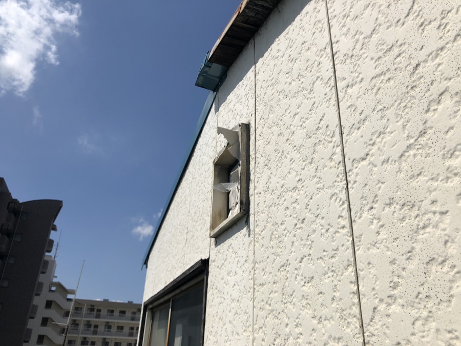 下から見上げてみると、裏面の軒も全て飛んでいました。また、換気扇のフードカバーも飛ばされていました。