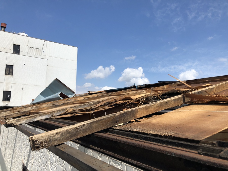 裏手に回ってみると、そこには下地ごと吹き飛ばされた屋根がありました。しっかりと固定されていたであろう木材も、強い力で引きはがされ、ささくれ立っていました。プレハブが建てられてから年数が経っていたという事もあり、木材も老朽化していたタイミングで台風が来てしまったと施主様もおっしゃっていました。