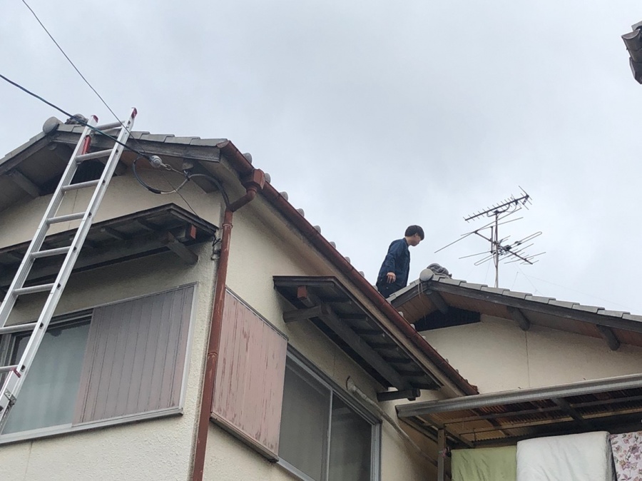 防水工事は職人さんに任せて、結局屋根の上に上がりました。台風直後アンテナが倒れて電気屋さんに戻していただいた屋根なのですが、その時に棟の瓦のズレや一部のし瓦が割れていたので、点検調査のの為にお伺いしました。被害状況の写真は保険屋さんには必須なので、しっかり点検して写真に収めました。
