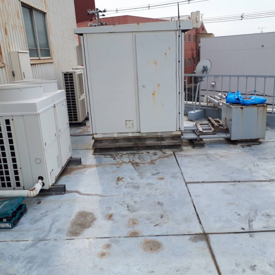 左を向けば室外機なども置いてあり、思ったより広い空間です。やはりこちら側もひび割れが目立ちます。まずは高圧洗浄で表面をキレイにしてます。機械周りの足元など下処理をして、防水の施工にかかっていきます。
