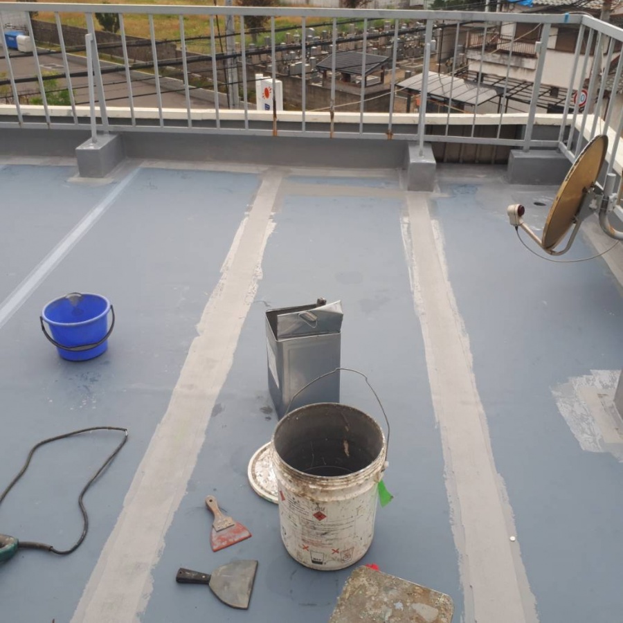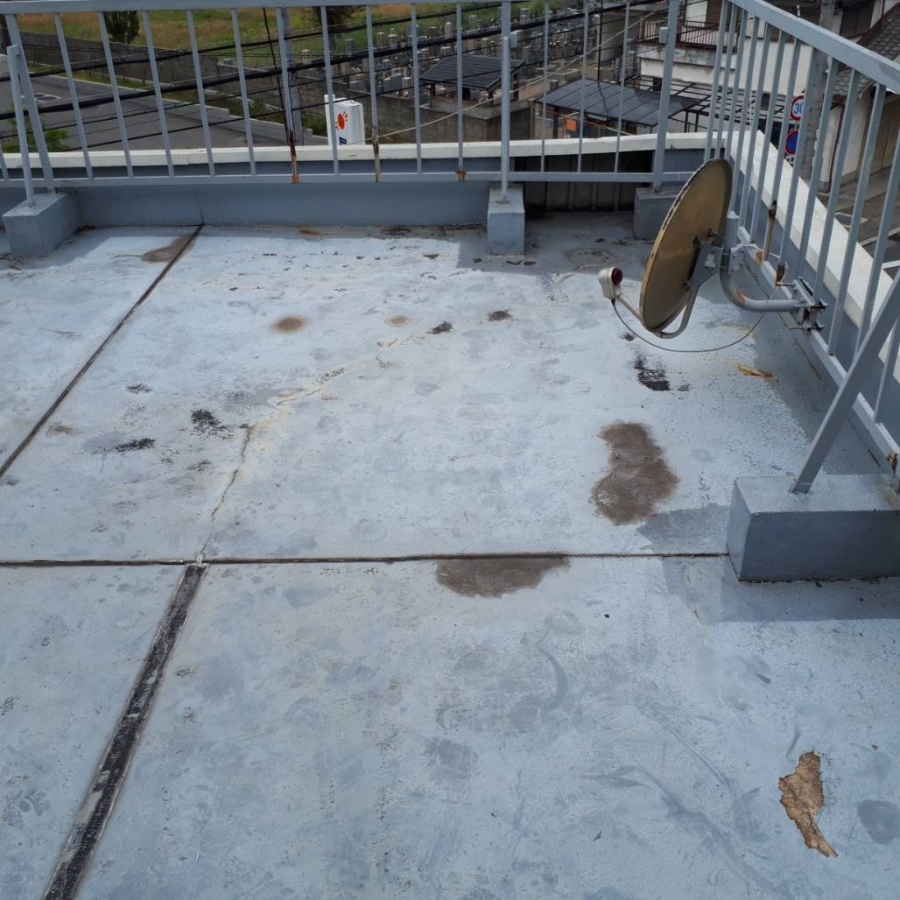 台風21号の雨以前から気にはなっていた3階建ての工場兼事務所の建物です。写真のすぐ下が事務所になっていて、台風21号の時は天井から雨漏れがあったそうです。事務所なので電子機器があったのですが、パソコン等に被害が無かったのが幸いです。まずは防水の状態を見て施工方法を提案。扉を開けてすぐの所ですが、すでに防水にひび割れがありました。表面の塗膜も劣化して一部剥げていました。職人と相談の上、ウレタン塗膜防水 国土交通省X-1の施工をします。
