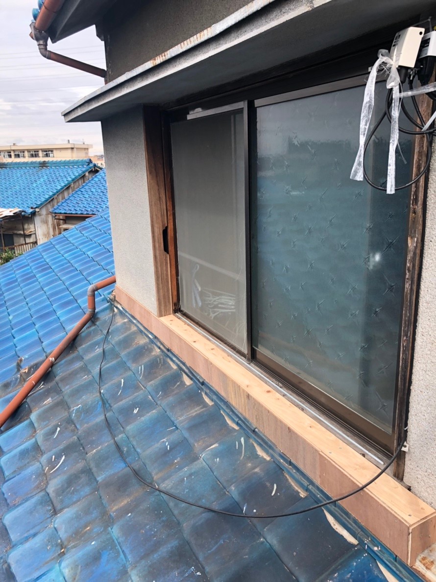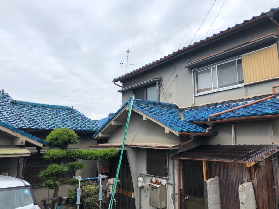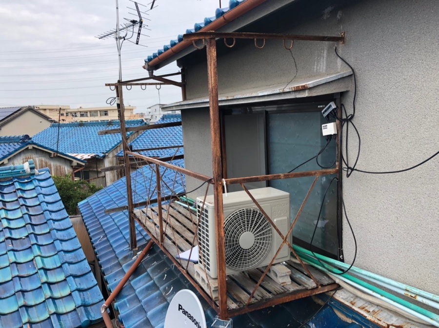 八尾市で台風による被害のご相談をいただきました。木造2階建て2階部分の窓から洗濯物が干せるように、瓦の屋根の上にベランダが設置されていました。アルミ製のテラスも瓦屋根も飛ばされるぐらいの大きな台風は、こちらのお家のベランダの屋根を崩しました。強風にあおられた事で、ベランダの骨組み自体も外れかかり危険な状態でした。