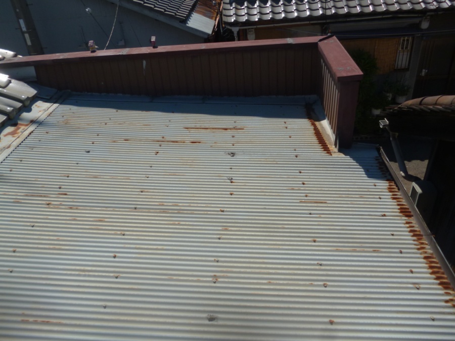 トタン屋根の現状を見てみると、西向きの屋根の表面のいたる所に錆びが出ていました。鋼板製のトタンに錆が出てくると、穴が開いて雨漏れの原因になります。