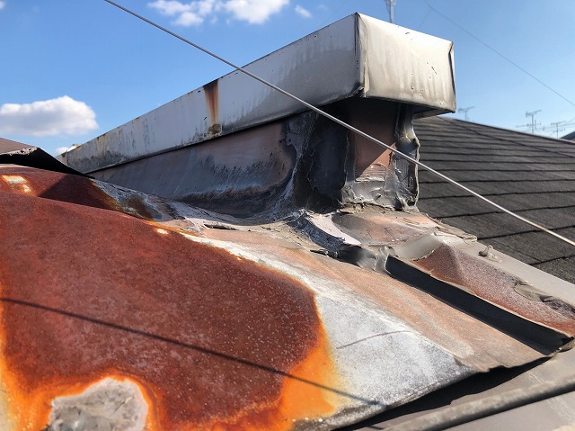東大阪市の3階建てで雨漏れ屋根の谷板金貼替をしました
