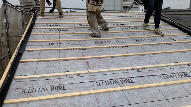 軒先部分の高さ調整(ここでは35㎜角材を使用。場所によっては胴縁を使う時もあります。)