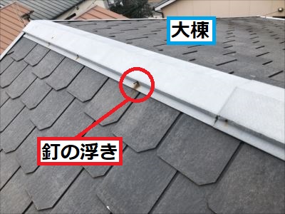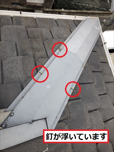 ※固定している釘が浮いていると、強風の影響で棟板金が飛散しやすい状態になっています。