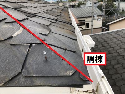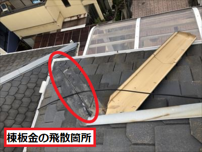 軒樋へ向かって伸びる『隅棟』の板金が飛散していました。