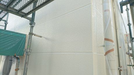 吹付けています。ピンク色調の仕上がりなので、下塗色を表面に出さない為に、中・上吹付共同色で重ね吹きをします。