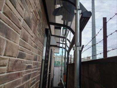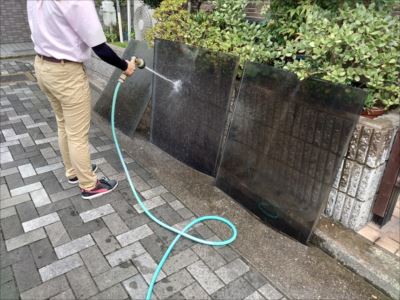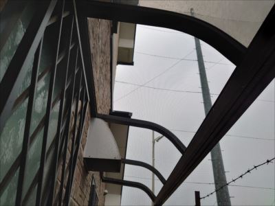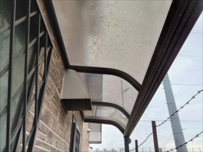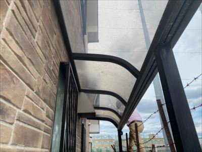足場設置の為に仮撤去していた通路の屋根パネルを復旧します。復旧する前に長年の汚れも溜まっているのでこれを機会に清掃もさせていただきました。
