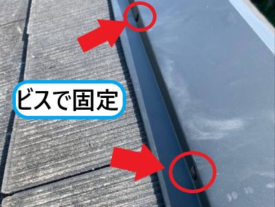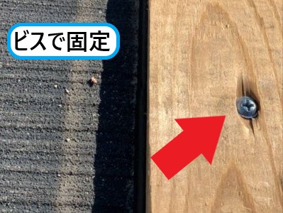 ビスは側面から貫板に向けて打ち込んでいます。上から打ちこむ方が固定しやすいのですが、ビス穴から雨水の影響を受けやすくなってしまうので、基本的には板金の側面からビス固定をすることが多いです。