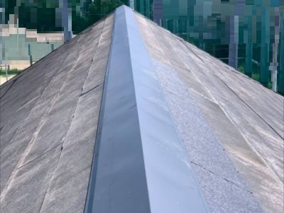 大阪市平野区にて劣化した貫板の新設と強風で飛散した棟板金の復旧工事を行いました。