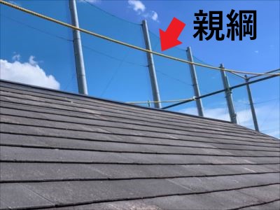屋根の勾配が急なので親綱を設置しました。作業時にこの親綱に安全帯を掛けて作業をすることで、万が一の落下を防げます。
