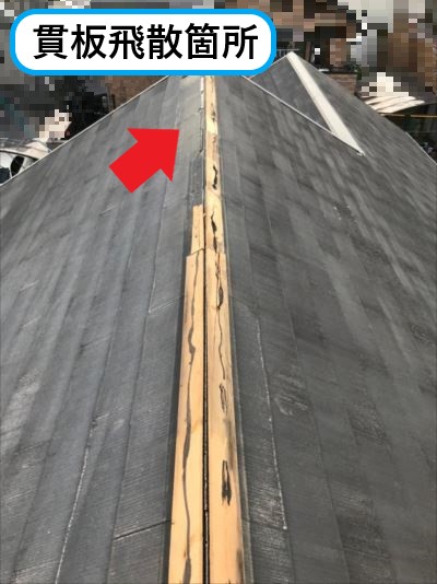 貫板はビスで固定しています。貫板が飛散する際にスレート屋根材に向けて打ち込んでいるビスの影響で破損したのだと思われます。