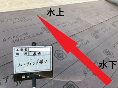 水下側から順に張っていくと、ルーフィングの重なりは水上側が上になるので、流れ落ちてきた雨水がルーフィングの隙間から入り込むことが無くなります。