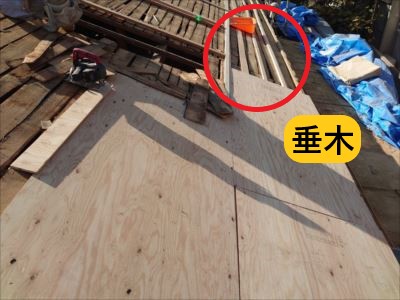 凹凸が見られるので、垂木を据えてその上に野地板を張り付けます。垂木を下地にすることで不陸が無くなり、真っすぐ綺麗に野地板を張り付けることが出来ます。