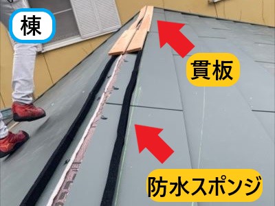 横から雨水が入り込むのを防ぐ防水スポンジ、棟板金を固定