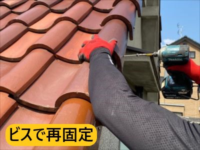 既存の釘よりも長さのあるビスで固定し、下地の腐食は見られなかったのでこれで瓦が落下する恐れはなくなりました。