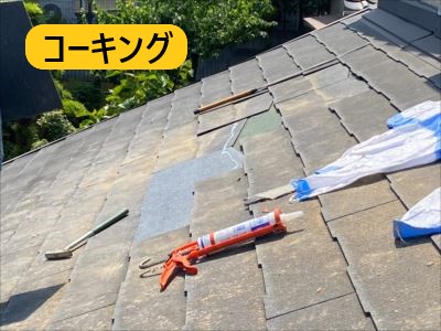 新しいスレートを差し込む面にコーキングを打設して、新しいスレートがしっかり固定されるようにします。