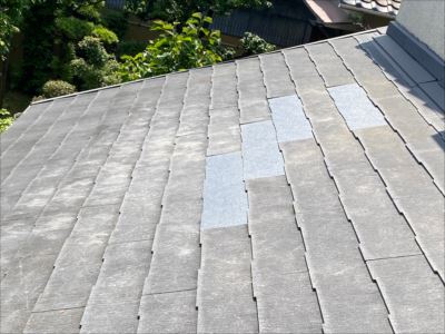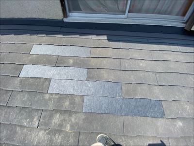 既存のスレートは劣化して色褪せているので、新しい物とは色が違って見えますが仕方ないですね。将来スレートの塗装を行なえば、色は統一されます。