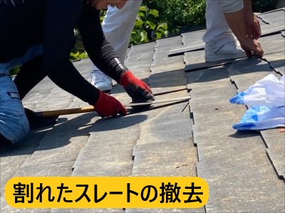 まずは既存の割れたスレートを撤去します。既存のスレートは釘で固定されているので廻りのスレートを割ってしまわないように、ノコギリで釘を切断して外します。この作業が大変なんです。