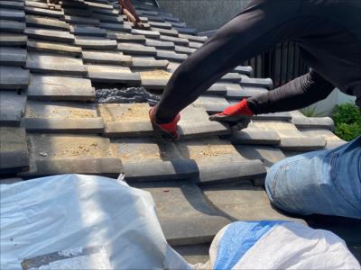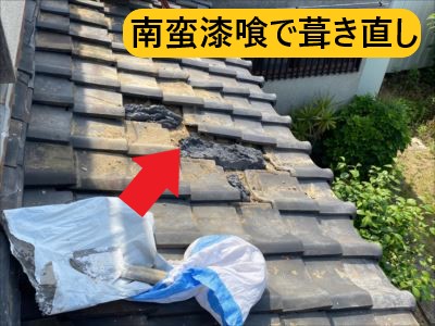 既存の割れた瓦を撤去して、葺き土の代わりに南蛮漆喰を敷いて瓦を葺き直します。