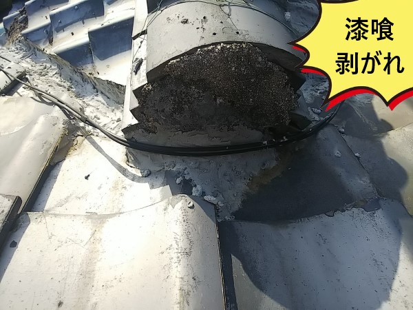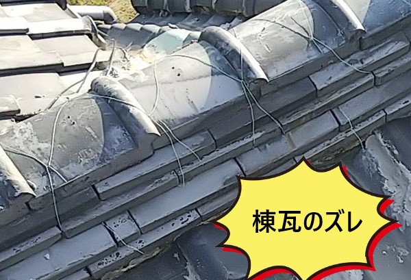 棟瓦がズレる原因は、漆喰の劣化によるものが殆どです。漆喰が剥がれると、葺き土を雨から守る壁がなくなって葺き土が直接雨を吸って固定力がなくなってしまいます。