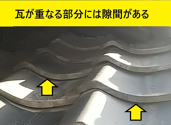 瓦は取外す事ができるように重なった部分には、隙間があります。この隙間は、湿気や雨水の排出する為には絶対に必要なものです。