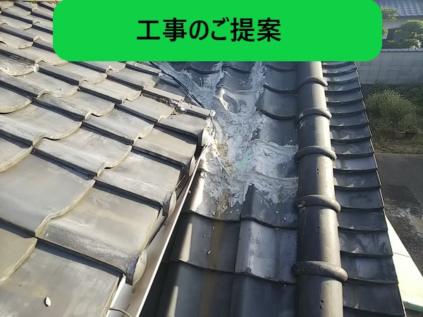 屋根に上がると谷周辺や瓦の隙間が漆喰で塞がれていました。お客様にお伺いすると『瓦と瓦の隙間から雨が入ったに間違いない』と思ってしまい、ご夫婦で漆喰を購入して隙間を塞いてしまったそうです。