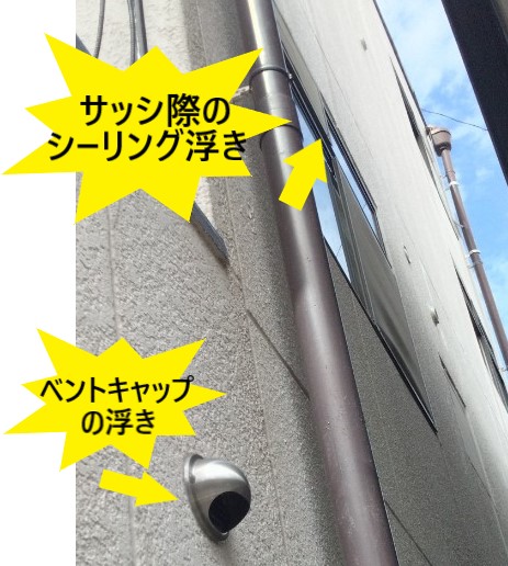 近くで見ると、サッシ際やベントキャップのシーリングが浮いており、そこから雨水が吹き込んでいると考えられます。