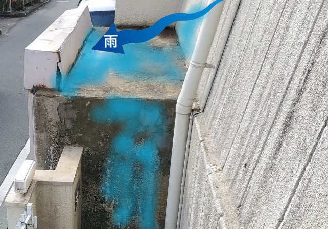雨水が板金の隅を通り道路側へ流れていくように少し傾斜を付ける為にも、板金に水切りなどを取付けていれば、状況は変わっていたと思われます。