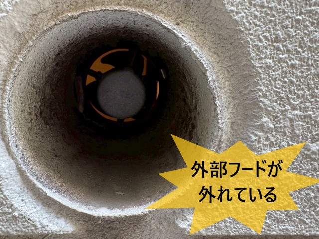 トイレの外側を点検すると換気扇の外部フードが脱落していました