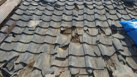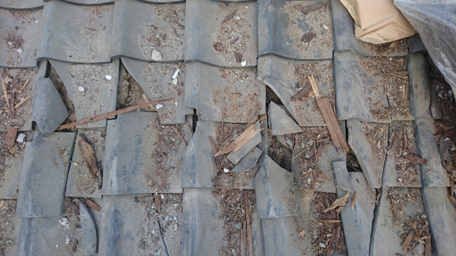 右写真が撤去後の屋根瓦の損傷状態で、床の土台が直接掛かっていた平瓦は割れて雨漏りの原因になります。