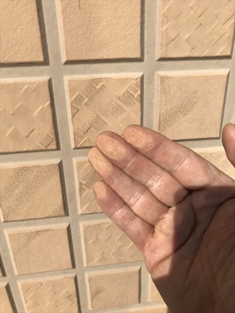 外壁のチョーキングしている写真です。南面の外壁は、紫外線や太陽の日がよく当たる部分であり、防水効果がなくなってました。足場も架けるのであれば外壁塗装もお勧めいたします。