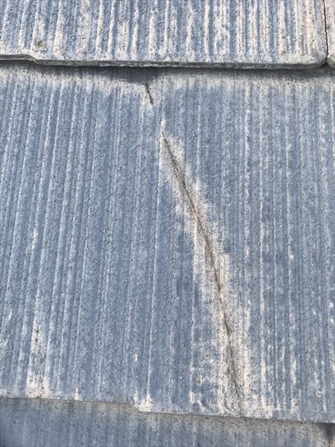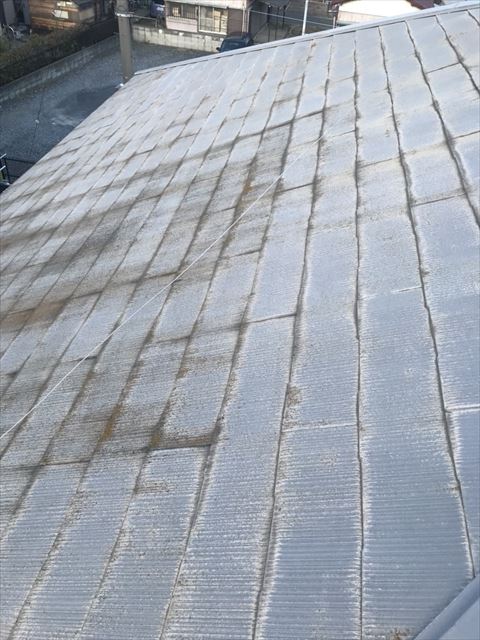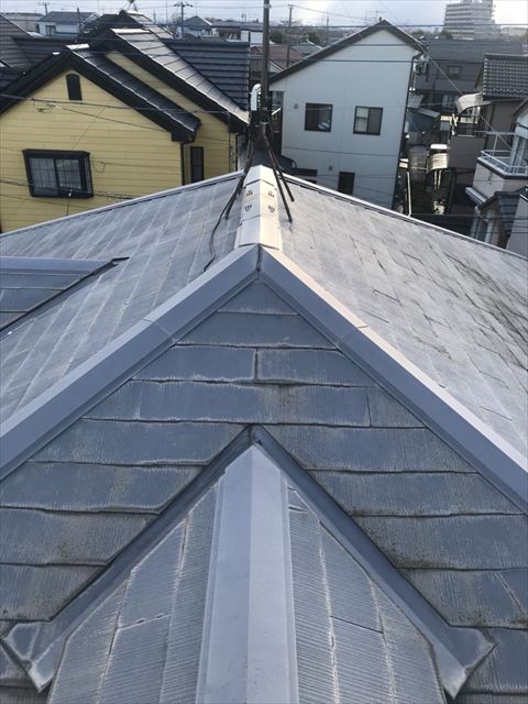 続いては屋根の状態です。屋根自体は目立つクラックはなく、棟板金の釘も浮いてないので、まだしっかりしていますが、葺き替えまでいかず、屋根塗装で十分かなと思います。