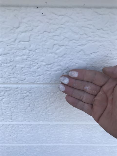 外壁チョーキング写真です。このチョーキングが建物全体にあり、防水効果がない証拠ですね。サイディング自体は塗装で、まだ大丈夫です。