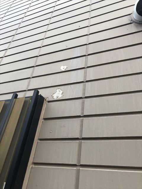 外壁の一部に塗膜の剥がれがありました。経年劣化でしょうか?写真の部分2か所だけ剥がれがありました。