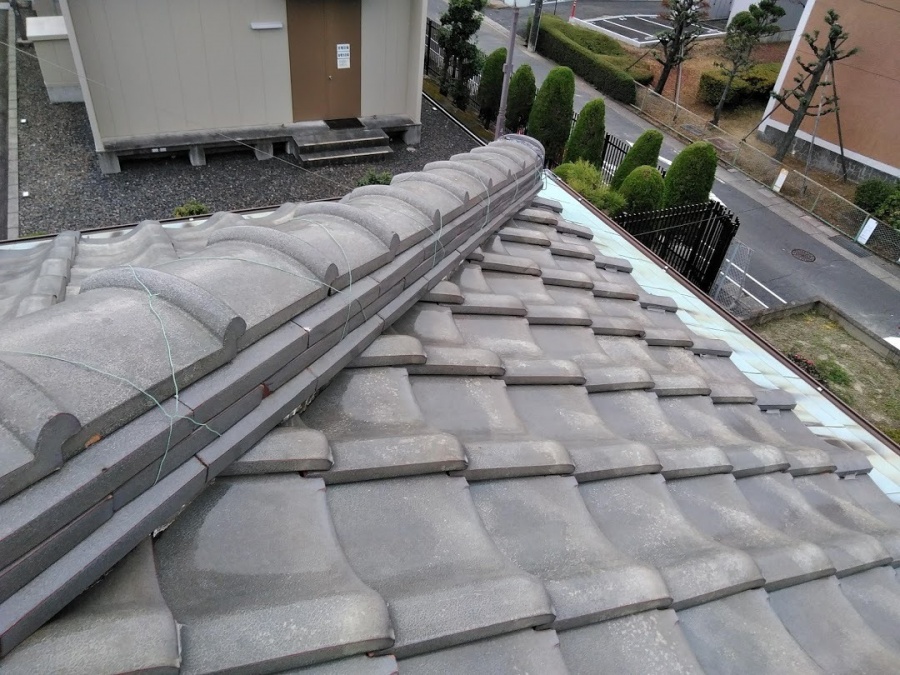 二階屋根を見ると棟瓦が横に大きくずれていました。このように、強風や地震による振動で瓦自体がずれたり割れたりすることもあります。