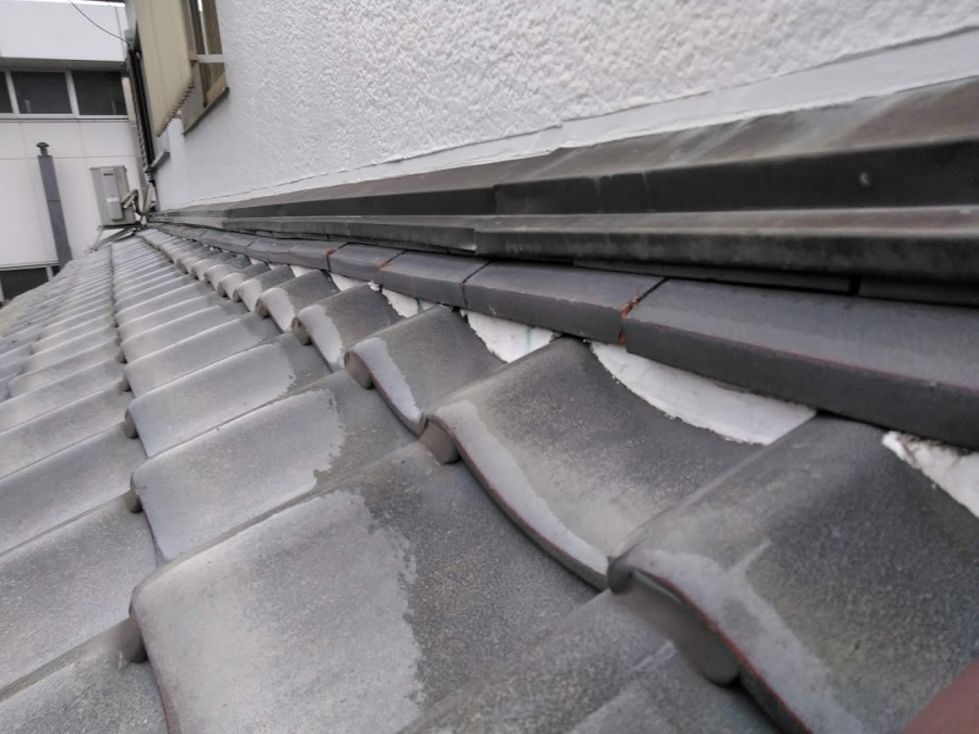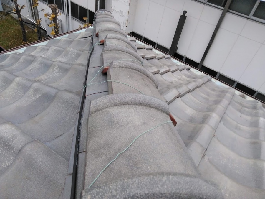 続いて一階屋根(瓦)の部分を確認していきます。表面がつるっとしている釉薬の瓦です。