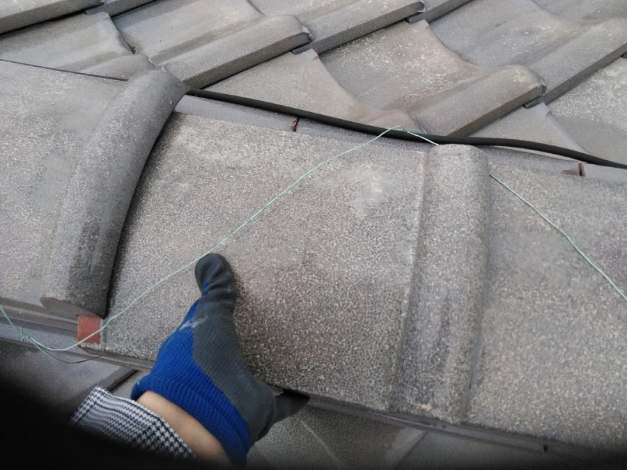 瓦一つ一つにコーキングでつなぐラバーロック工法で補修された形跡があります。