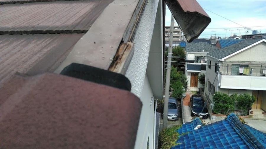 板金部分を見ていくと、なんと一部完全に剥がれている箇所がありました。ケラバの瓦が落下して跡形もなくなっています。