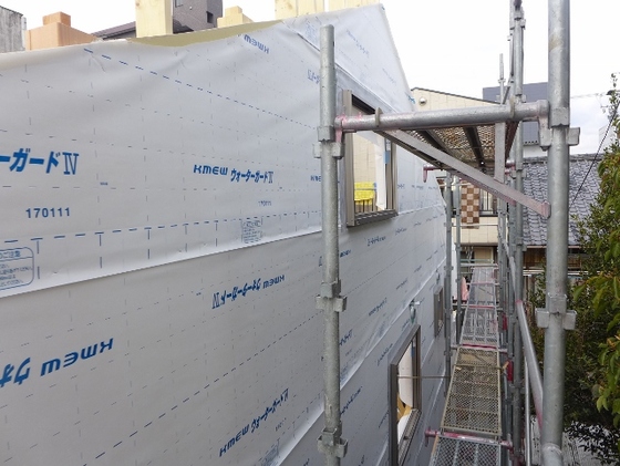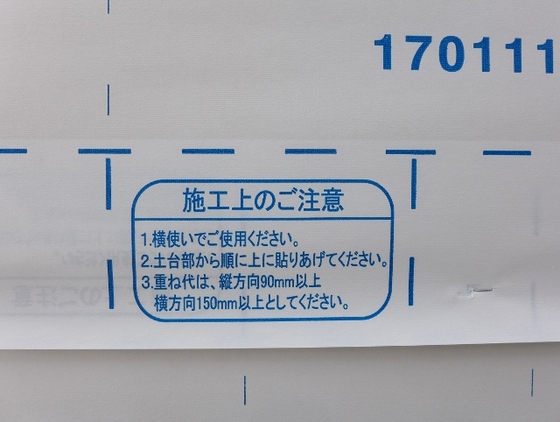 外壁を貼る工事の前に、まず防水層をしっかり作っておくことが大切です。そこでウォーターガード! 透湿防水【紙】を貼ります。防水なのに【紙】?と驚かれました?