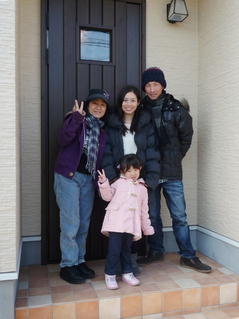 完成の記念写真。御夫婦とお母さんとことねちゃん♪ 狭小敷地ですが建物を上に伸ばすことでこだわりデザインのお家あ完成しました。