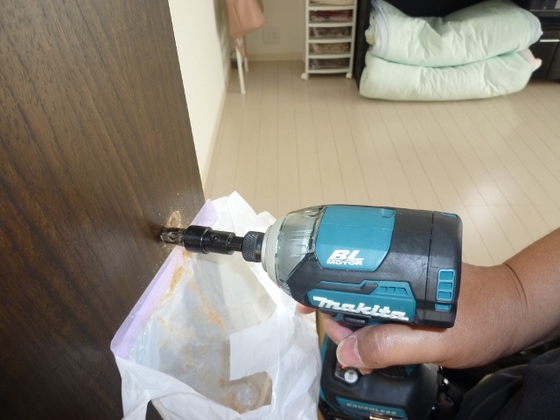 静岡市葵区鷹匠で内装ドアにカギを設置する工事を行ってます。